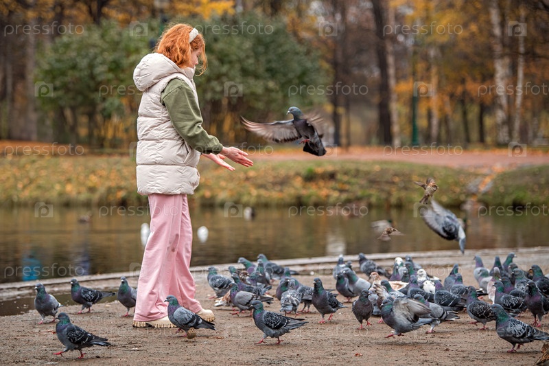 Счастливая рыжеволосая девочка кормит голубей из рук во время прогулки в осеннем городском парке. Тихая, мягкая, пасмурная погода