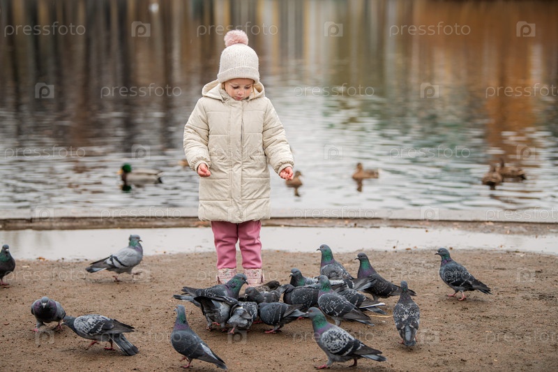 Счастливая маленькая девочка кормит голубей из рук во время прогулки в осеннем городском парке. Тихая, мягкая, облачная погода