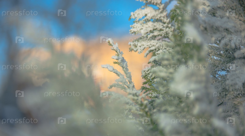 Заснеженные ветки ели на светло-голубом фоне