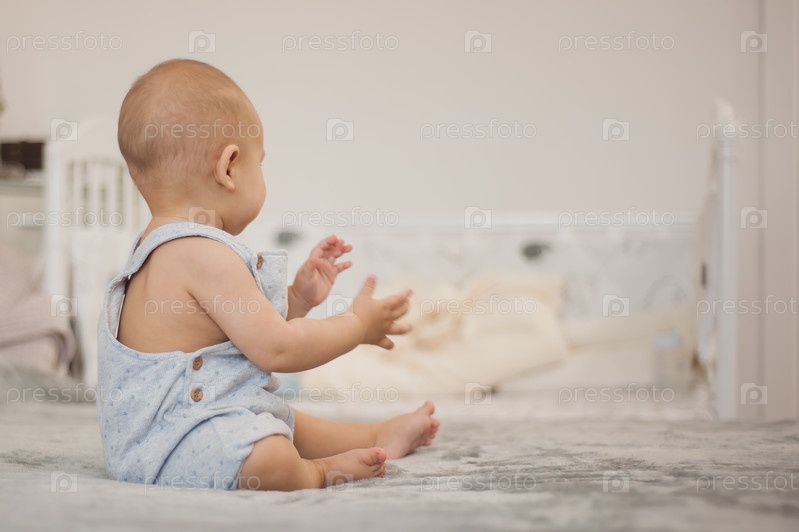 Ребенок 4 месяцев сидит на кровати, отвернувшись от камеры