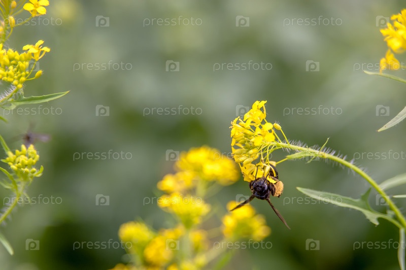 Пчела собирает нектар с цветка с пыльцой на лапках