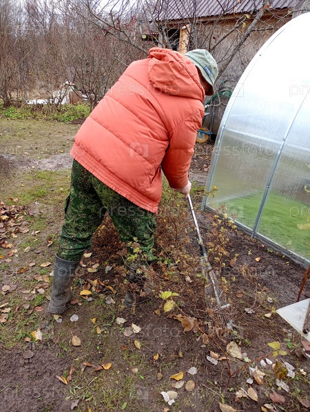 Мужчина повернут спиной и сгребает опавшие листья у теплицы в саду осенью
