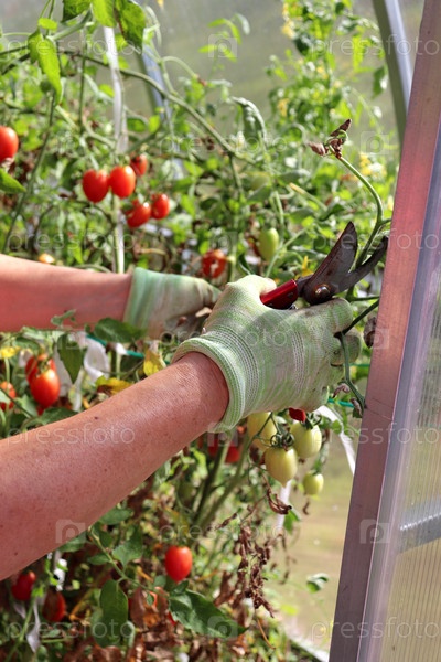 Женские руки в перчатках с секатором - уход за кустами томатов в теплице