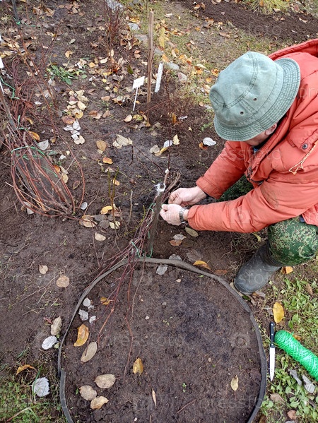Мужчина фермер подвязывает прижатые к земле виноградные лозы - подготовка растений к зиме