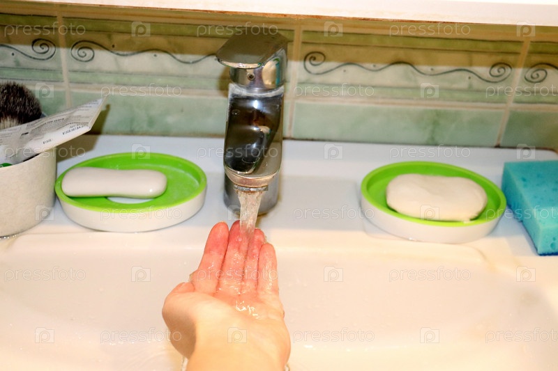 Женская рука под струей воды над раковиной в ванной комнате - гигиена