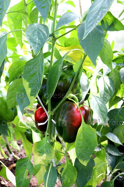 Куст с созревающими зелеными перцами с красными краями в теплице