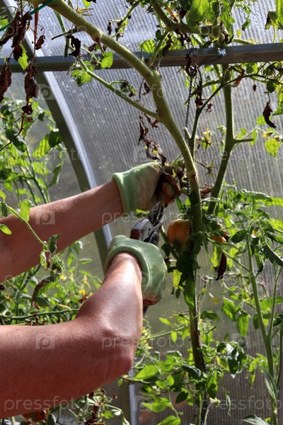 Женские руки в перчатках с секатором отрезают сухие ветки с кустов томатов в теплице
