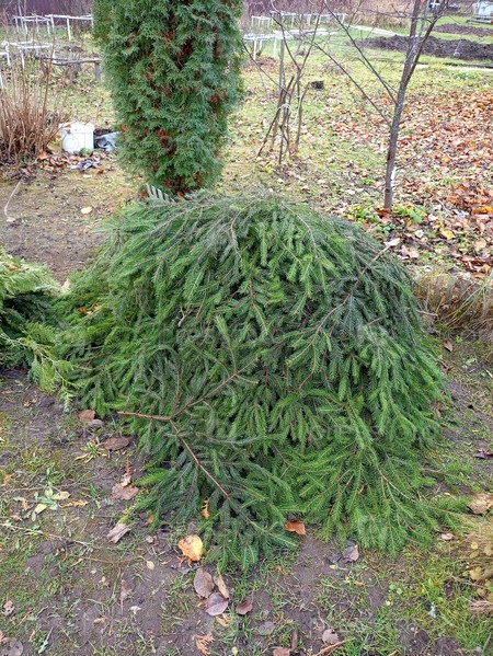 Стопка еловых веток, лапника для укрытия растений для зимовки в саду