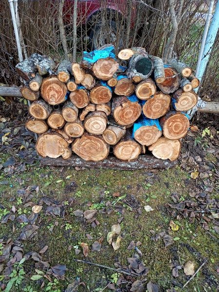Поленница со сложенными поленьями у забора в саду осенью