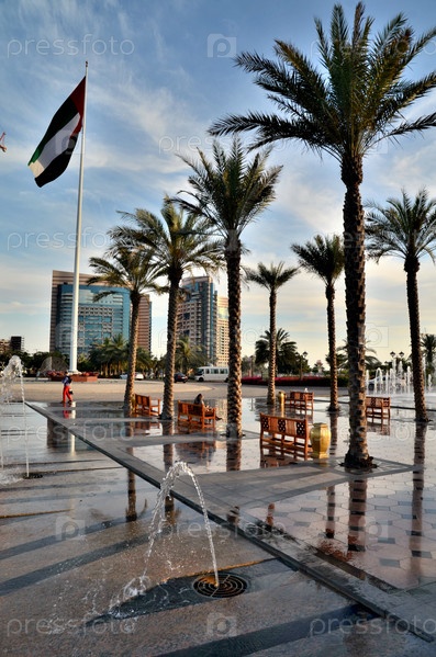 Фонтан на фоне небоскребов в Абу-Даби, Объединенные Арабские Эмираты