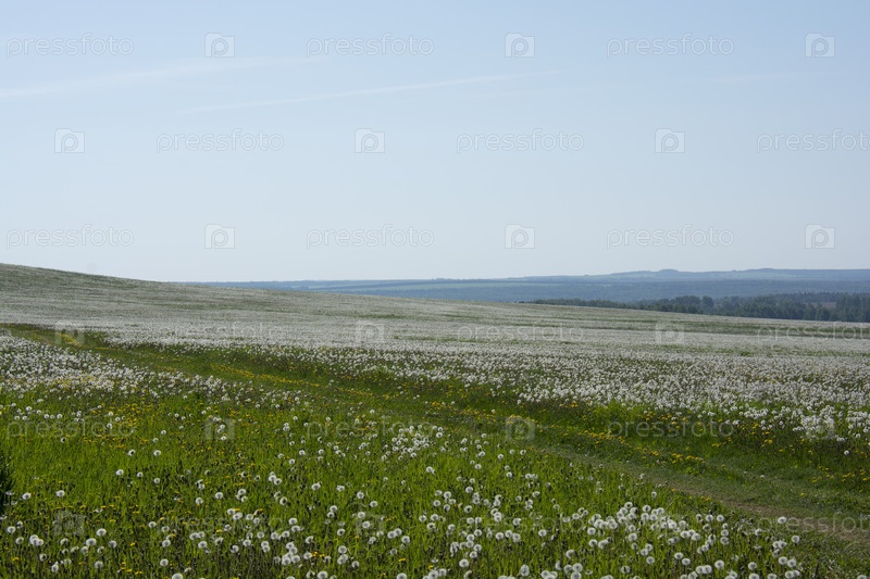 Поле с одуванчиками, дорога, небо и лес вдали