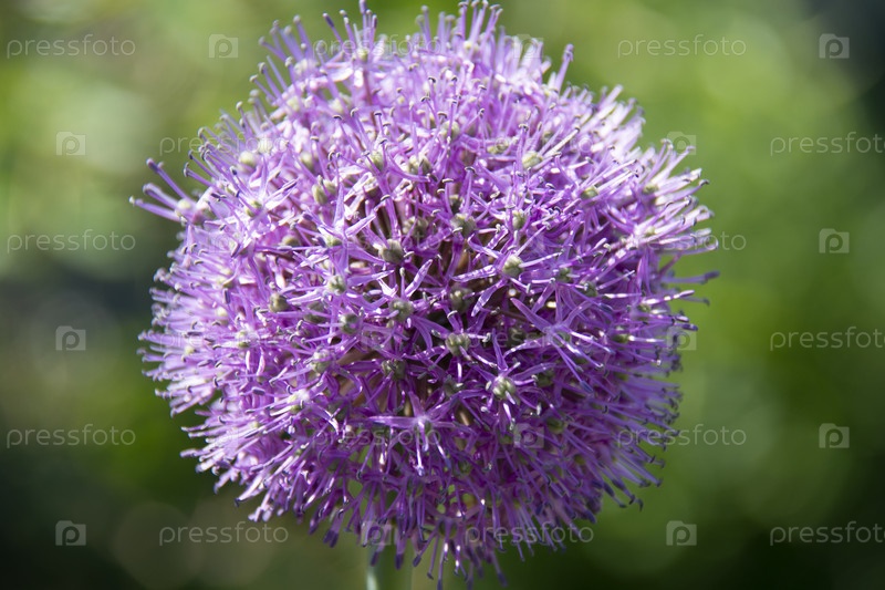 Сиреневое соцветие декоративного лука на размытом зеленом фоне