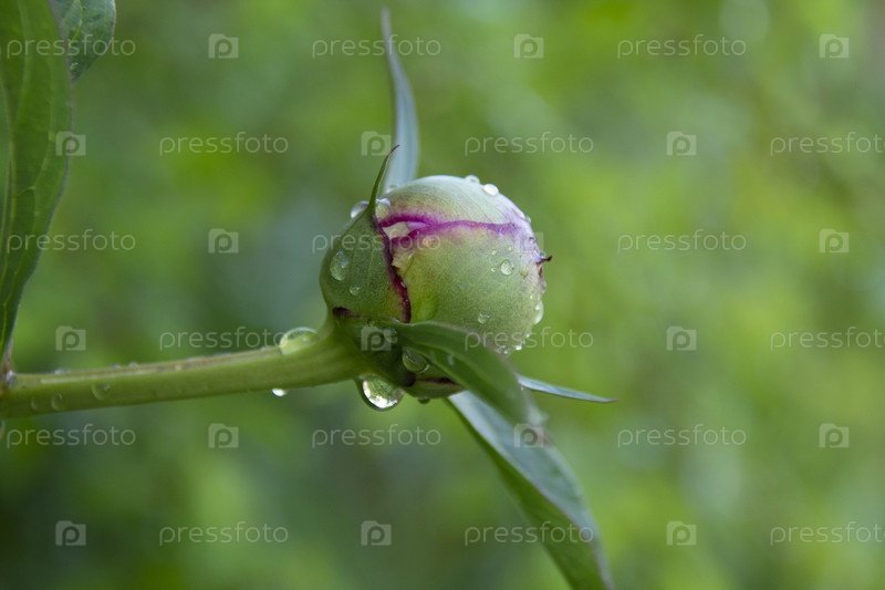 Бутон пиона с капельками после дождя на размытом зеленом фоне