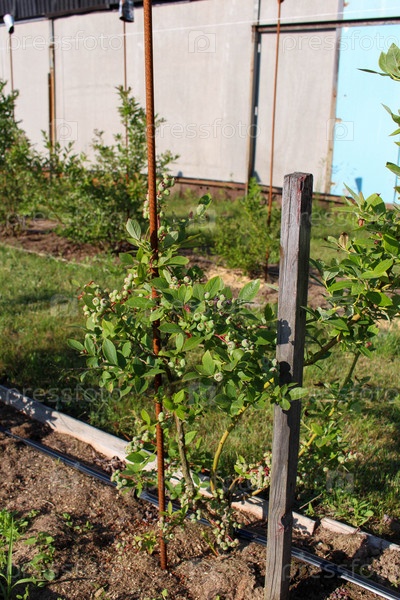 Высокий куст черники, посаженный в саду рядами, капельное орошение