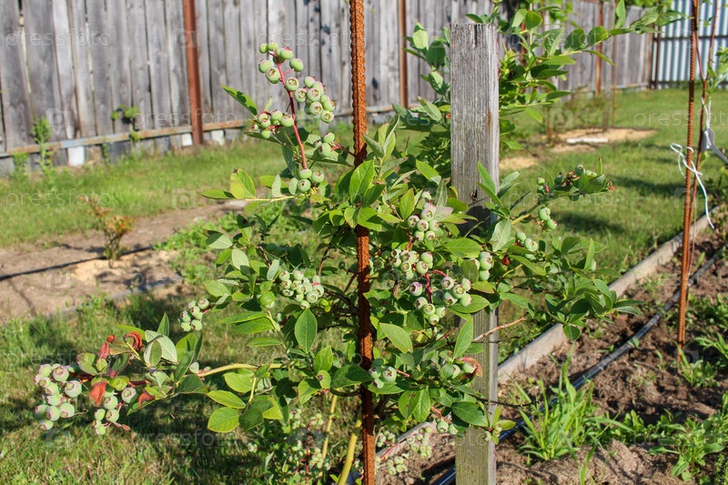 Высокий куст зеленой сортовой черники в саду в июне. много ягод