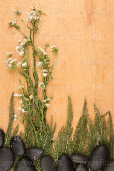 Дикие полевые ромашки, растущие из черных камней на светлом деревянном фоне. Концептуальное изображение