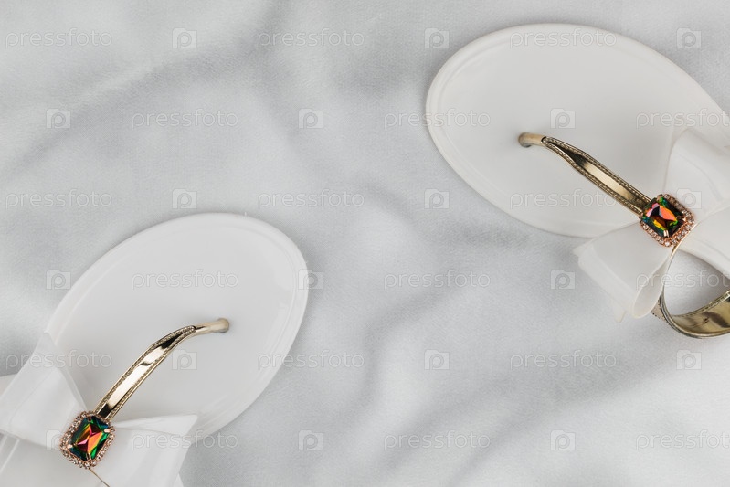 Пара пляжных белых шлепанцев, инкрустированных стразами, стоящих на мятом белом шелке