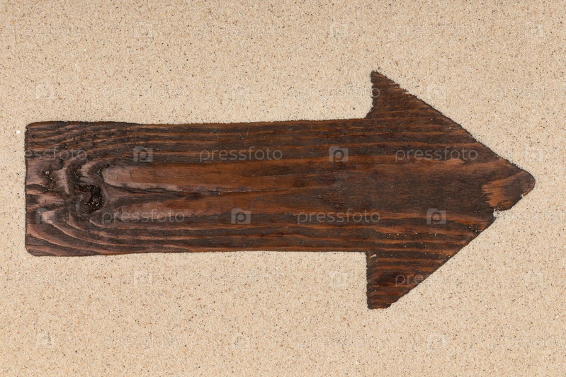Классическая стрела из темного дерева лежит на песке. С местом для текста
