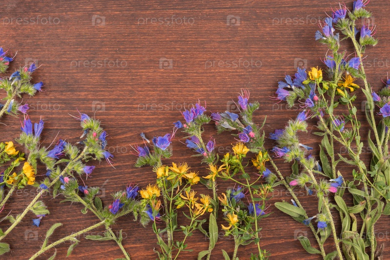 Красивые полевые цветы на деревянном фоне. Рамка из цветов