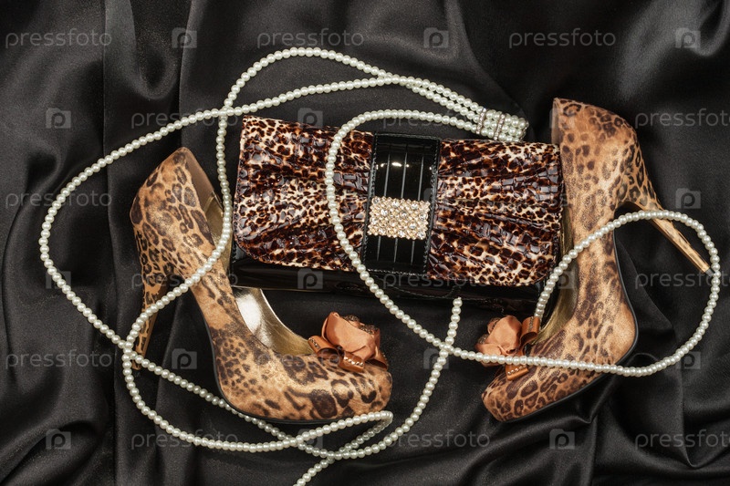 Элегантные леопардовые туфли, сумочка и белые бусы на черном атласе