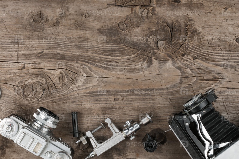Старые фотоаппараты и штатив лежат на деревянной поверхности
