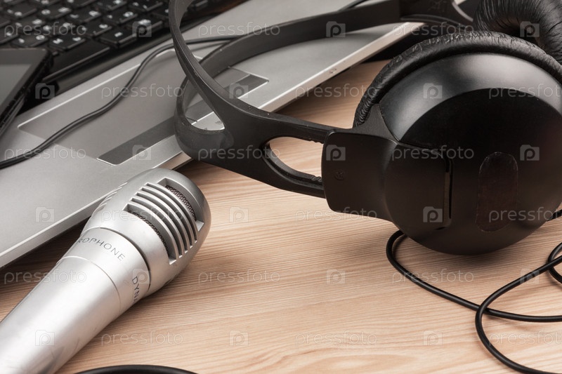 На столе микрофон, наушники и ноутбук