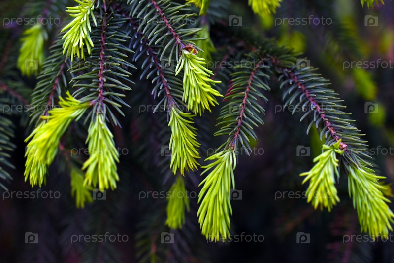 Ветки ели с шишками. Яркие и красочные иголки и шишки в лесу