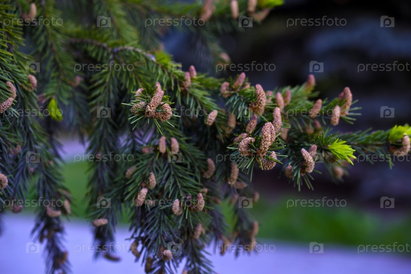 Ветки ели с шишками. Яркие и красочные иголки и шишки в лесу