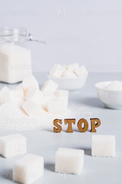 Концепция ограниченного потребления сахара, текст и сахар на столе вертикальный вид