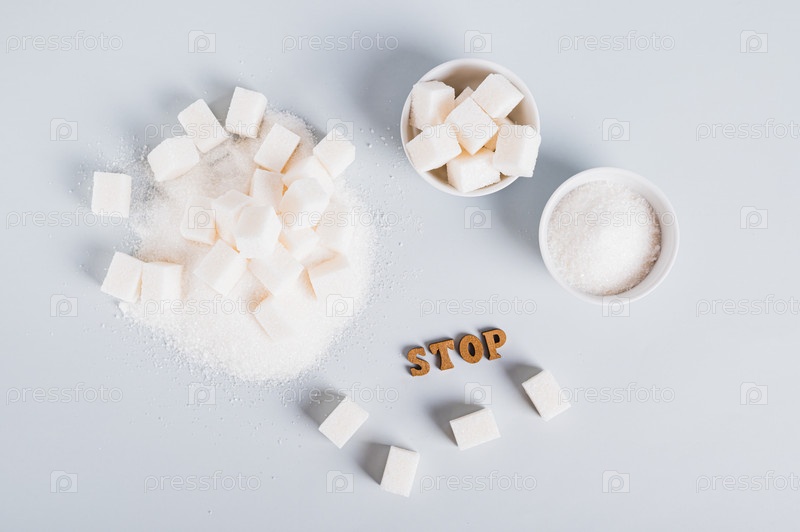 Концепция ограниченного потребления сахара, текст и сахар на столешнице