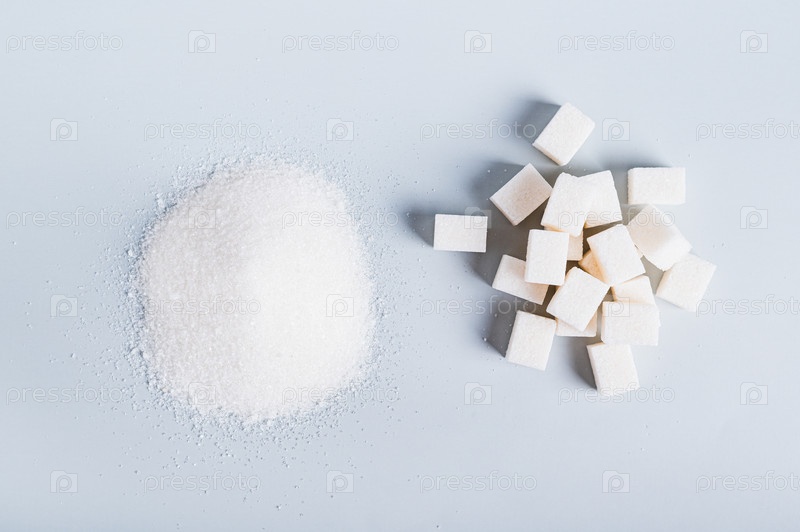 Альтернатива между кусковым сахаром и сахарным песком на синем фоне, вид сверху