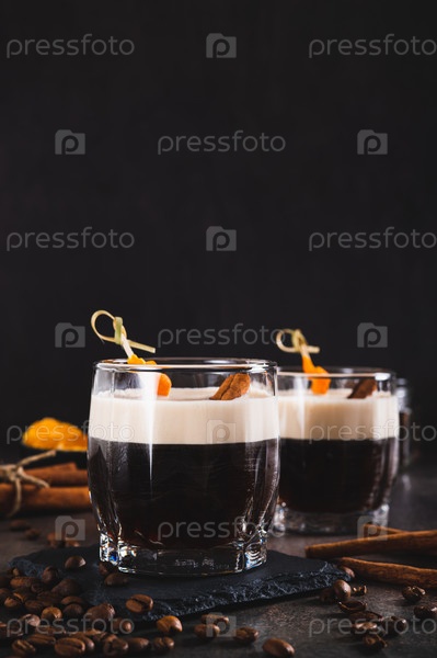 Испанский кофейный коктейль с корицей и апельсиновой цедрой в стаканах на столе вертикальный вид