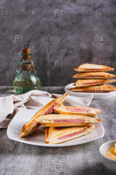 Треугольные сэндвичи на гриле с сыром и колбасой на тарелке на столе вертикальный вид