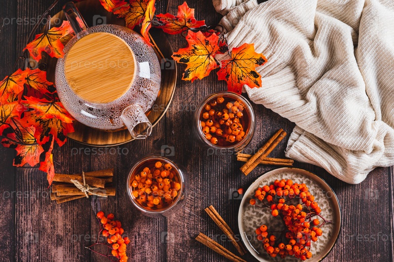 Чай с ягодами рябины в стаканах и чайник на столешнице вид