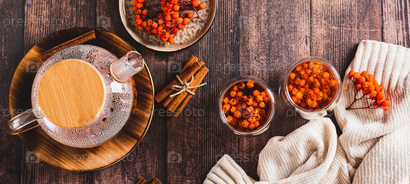 Согревающий рябиновый чай с корицей в стаканах и чайник на столешнице просмотр веб-баннера
