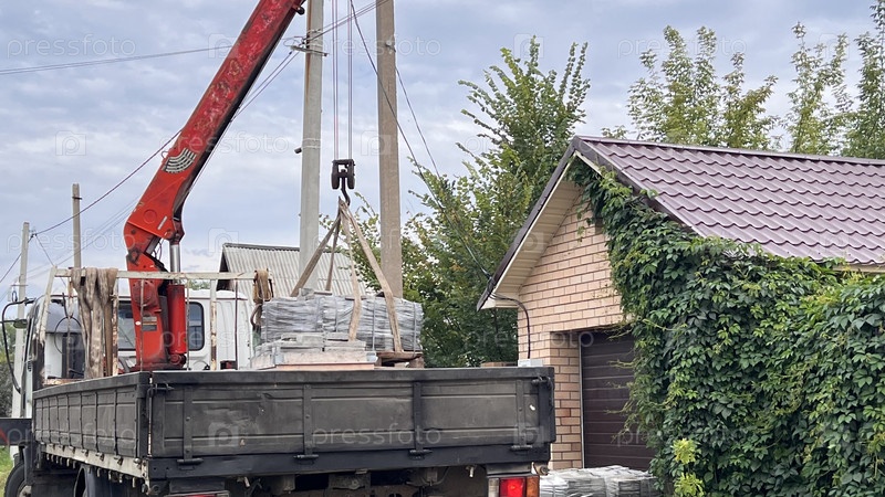 Манипулятор-погрузчик выгружает тротуарную плитку с помощью крана у дома в сельской местности. брусчатка, бетонная тротуарная плитка на поддонах