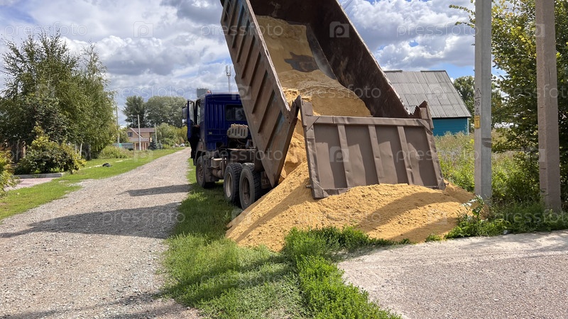 Грузовик привез песок на стройплощадку. Доставка сыпучих грузов. Процесс разгрузки