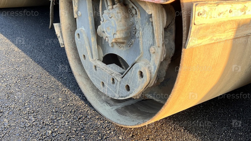 Каток для укладки асфальта. Дорожный каток укладывает свежий асфальт, работая на строительной площадке новой дороги