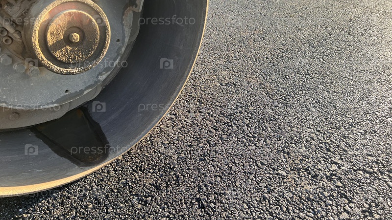 Каток для укладки асфальта. Дорожный каток укладывает свежий асфальт, работая на строительной площадке новой дороги