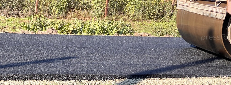 Каток для укладки асфальта. Дорожный каток укладывает свежий асфальт, работая на строительной площадке новой дороги