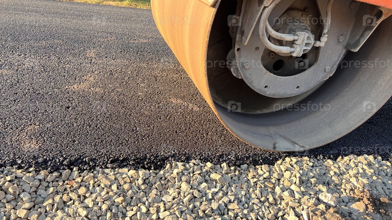 Каток для укладки асфальта. Дорожный каток укладывает свежий асфальт, работая на строительной площадке новой дороги