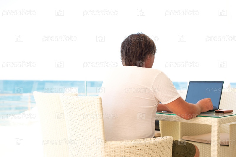 Рабочее место в кафе с видом на море. Мужчина работает на ноутбуке в кафе. Копировальное пространство. Макет