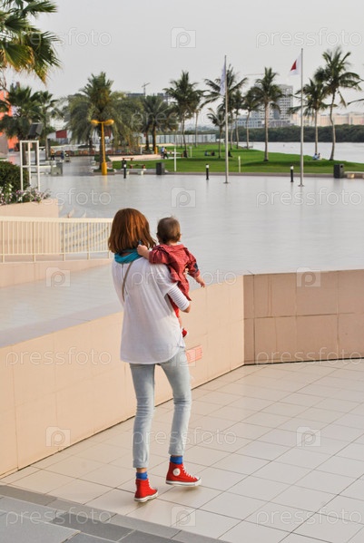 Красивая молодая женщина гуляет с ребенком в городе. Материнство - это радость. Мать и сын