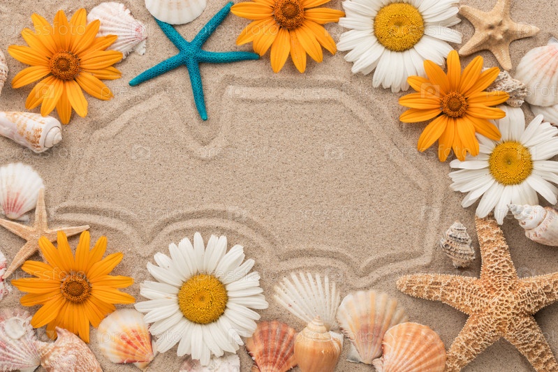 Красивая рамка из цветов, звезд и ракушек на песке