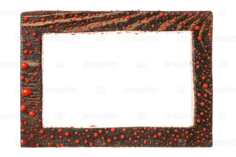Красивая деревянная рамка в каплях красной краски. Изолирована на белом фоне