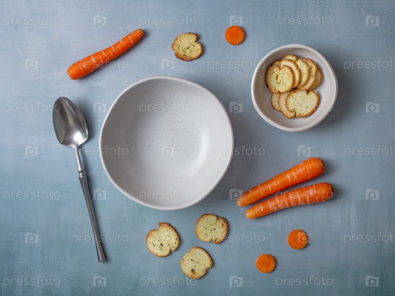 Пустая тарелка для супа, хлебные гренки, морковь на светлом фоне, плоская поверхность, вид сверху
