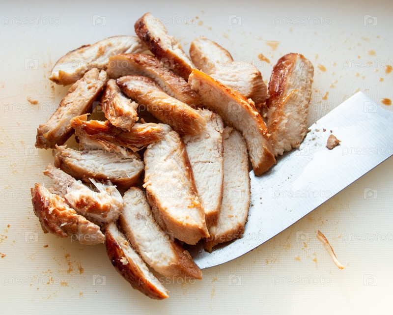 Жареная и нарезанная ломтиками куриная грудка на белой разделочной доске