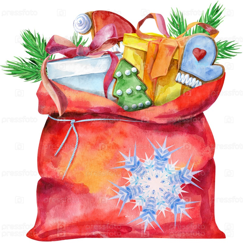 Полный подарок открыть Санта Клаус красный мешок. Акварельная иллюстрация