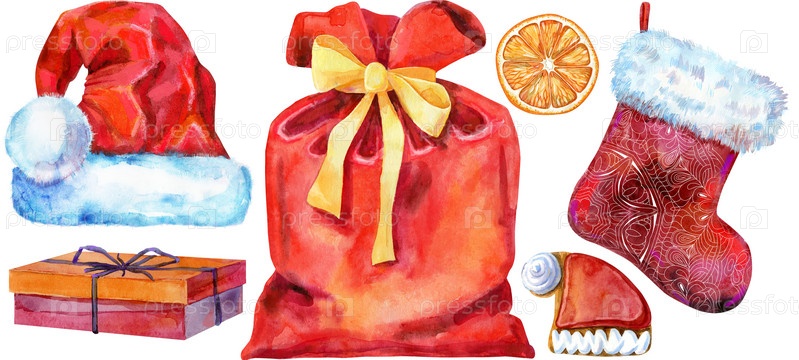 Рождественский Санта в красной шапке, сумке, мяче и носке для подарка, акварельная иллюстрация