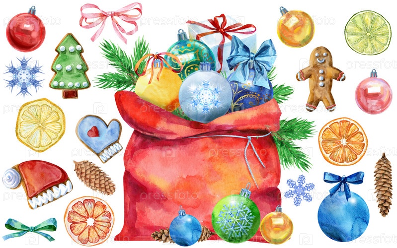 Рождественский Санта в красном мешке, шарике и прянике, акварельная иллюстрация